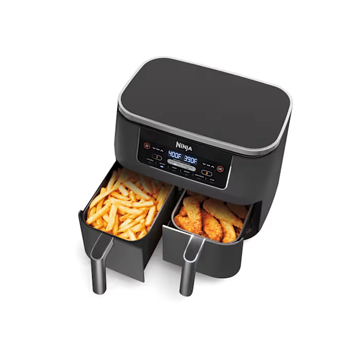 La freidora de aire Ninja® Foodi® 6 en 1 de 8 cuartos de galón con 2 canastas y tecnología DualZone™. La primera freidora de aire con 2 cestas independientes que te permite cocinar 2 alimentos a la vez, no en etapas como en una freidora de aire tradicional de una sola cesta.
